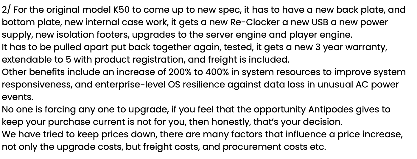 2/ For the original model K50 to come up to new spec, it has to have a new back plate, and bottom plate, new internal case work, it gets a new Re-Clocker a new USB a new power supply, new isolation footers, upgrades to the server engine and player engine.