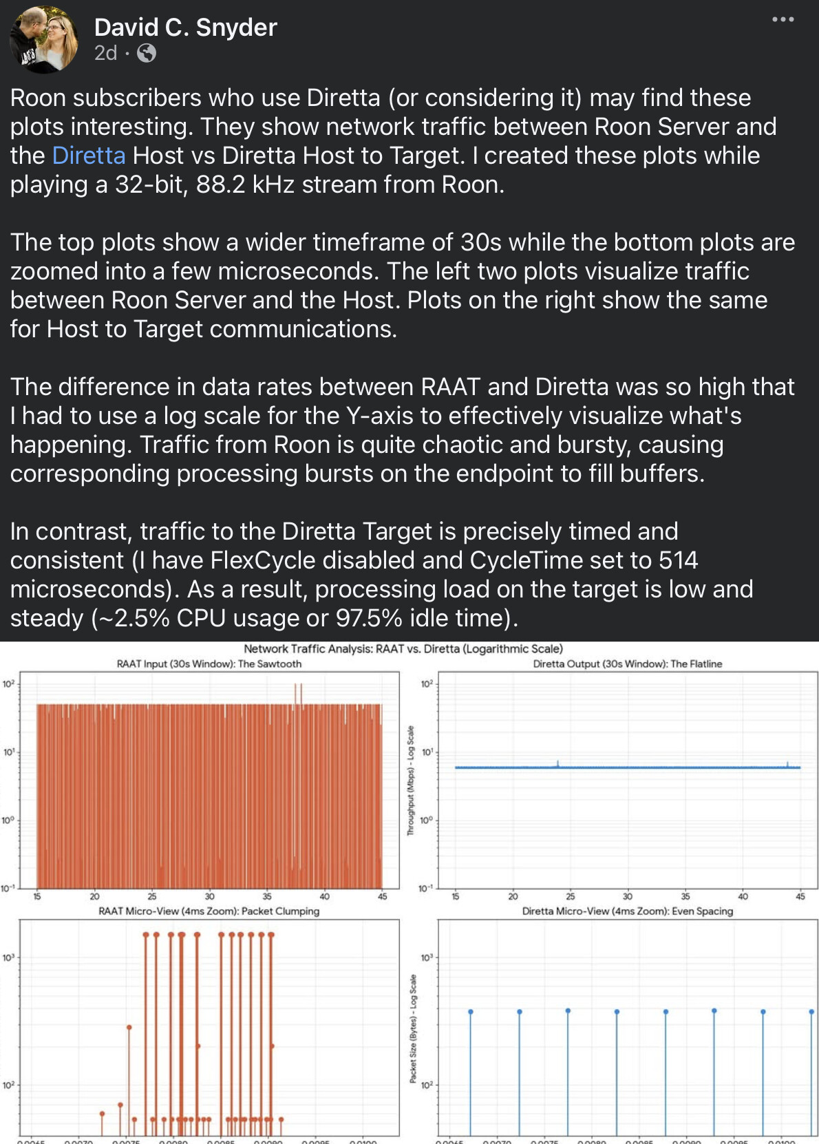 The following was posted to the Diretta Users group on Facebook. I cannot attest to the accuracy of his data, but I thought the charts were fascinating nonetheless. I think he nails with this quote: “Traffic from Roon is quite chaotic and bursty, causing corresponding processing bursts on the endpoint to fill buffers.” I don’t recall exactly what Emile from Taiko has said but I believe it’s the bursty behavior that he’s sought to make networking less-bursty as doing so would reduce noise. Fascinating stuff.