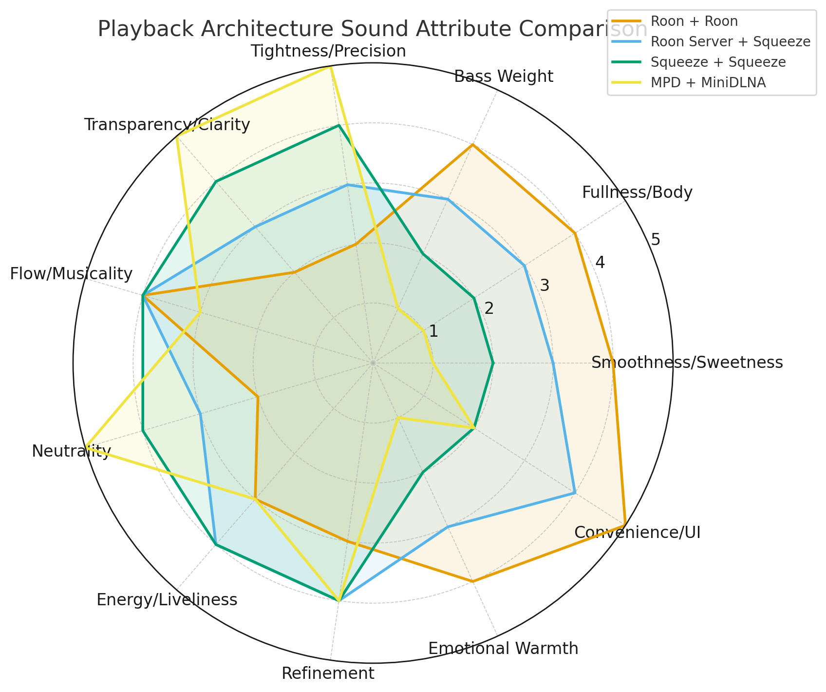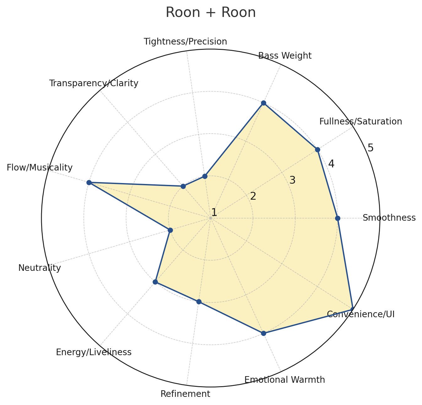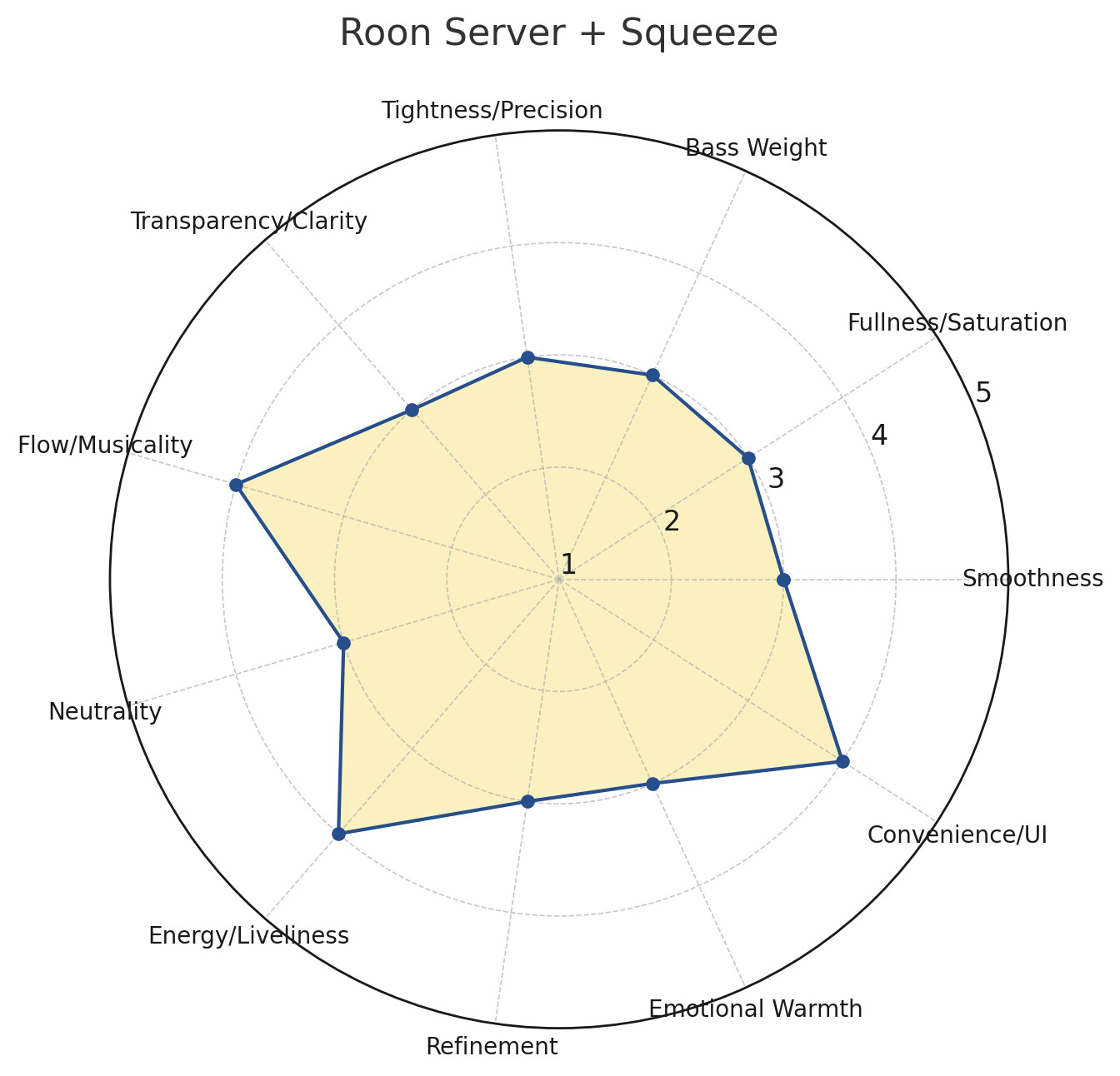 - Cleaner than Roon+Roon, warmer than Squeeze+Squeeze