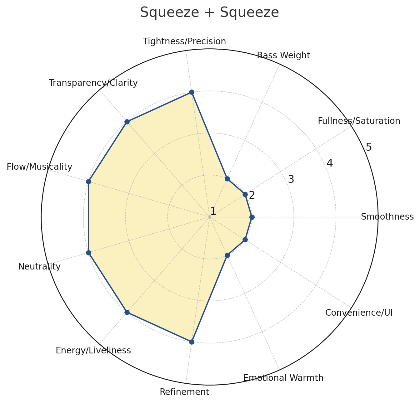 The chart is just an attempt to translate my impressions, together with a few others, into a visual overview. It’s normal that different listeners prioritise different aspects. For example, if many indeed find Squeeze to Squeeze strongest in transparency and tightness that is completely valid.