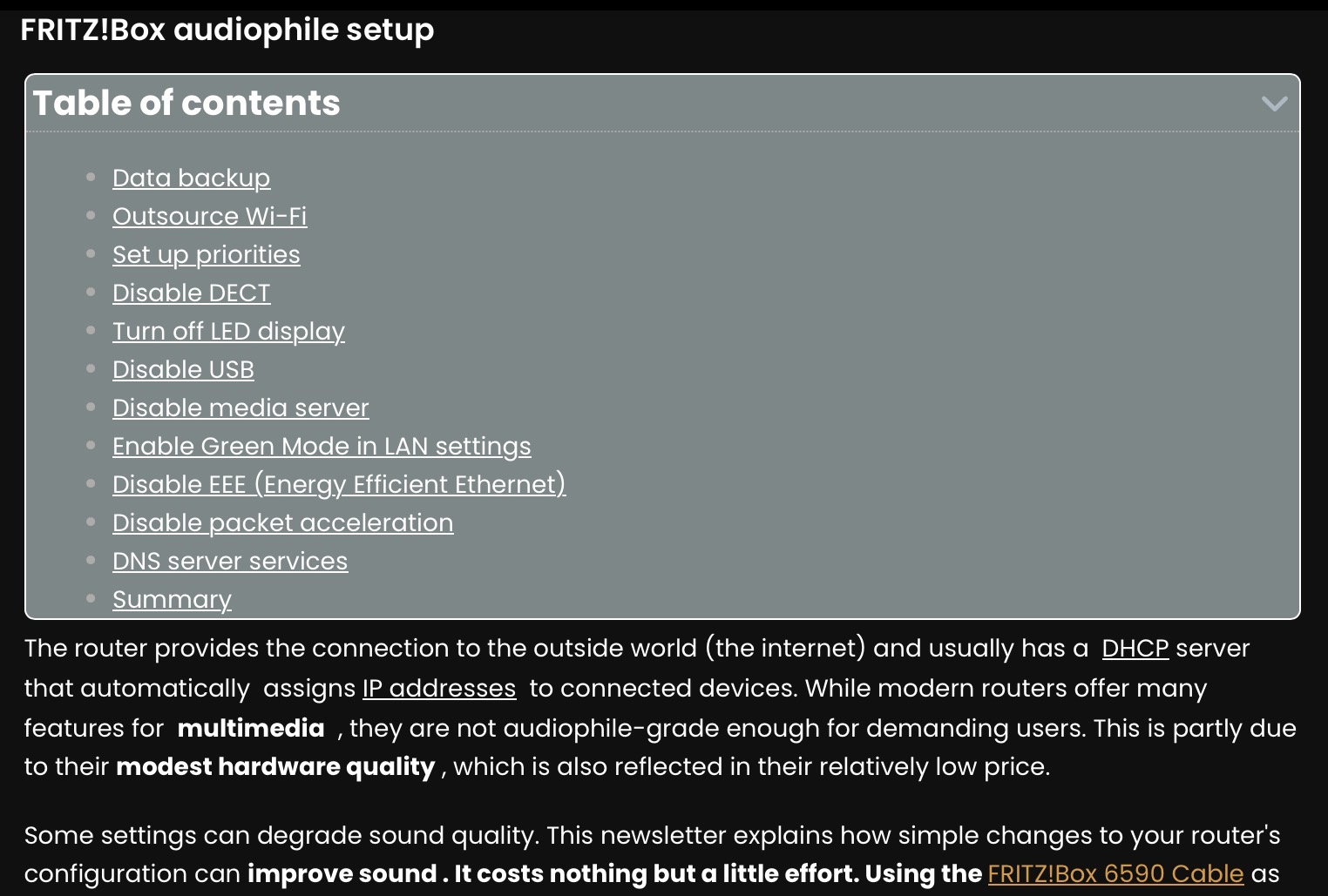 PPS: Just in case the Fritz!Box is playing a role, there are some proven tweaks you can make to lower noise and minimize any impact. It won’t hurt to apply them, even if they don’t end up being the main cause… FRITZ!Box audiophiles Setup – Grigg Audio Solutions