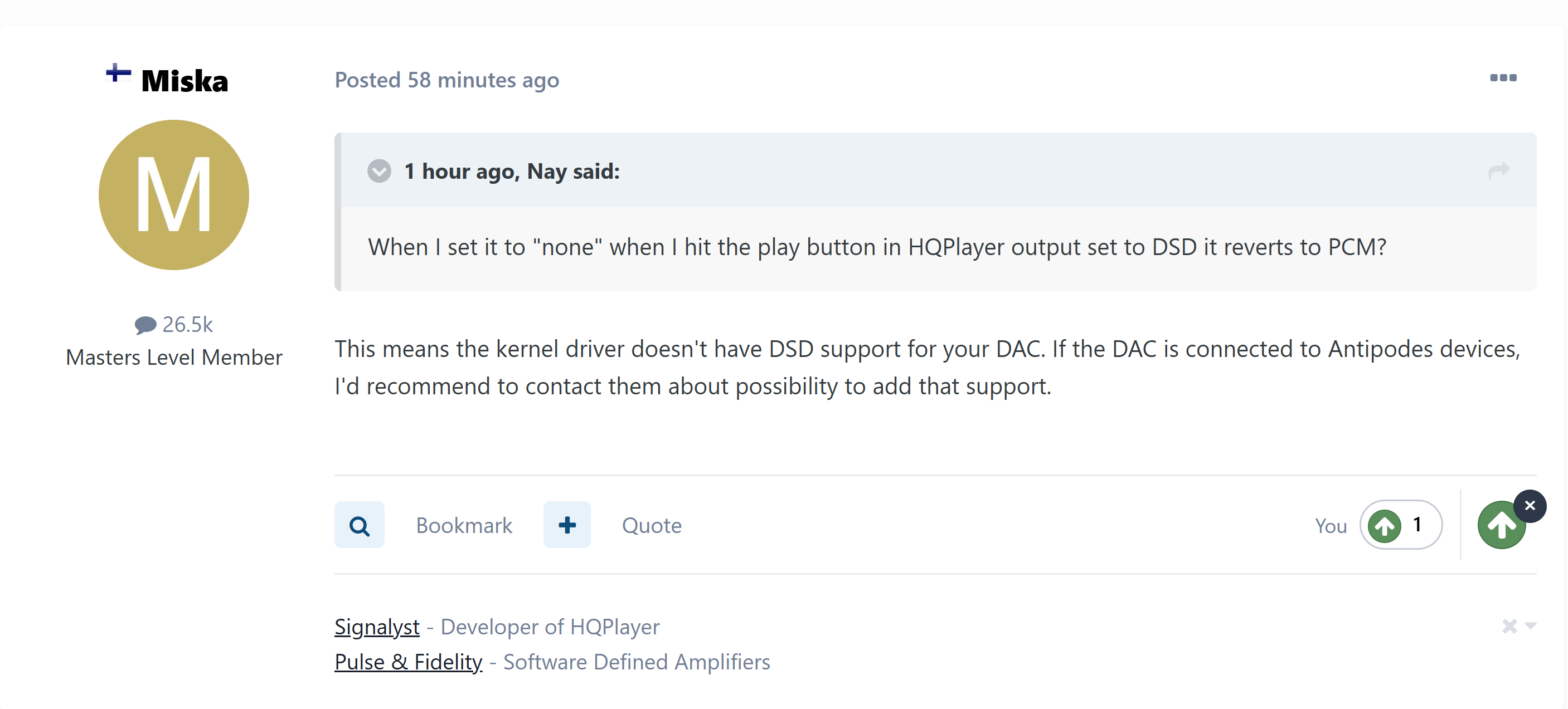 @kennyb123 It plays DSD256 but not Native I have to set HQPlayer SDM pack to Dop if its set to “none” when I hit play in HQPlayer it reverts from DSD to PCM.