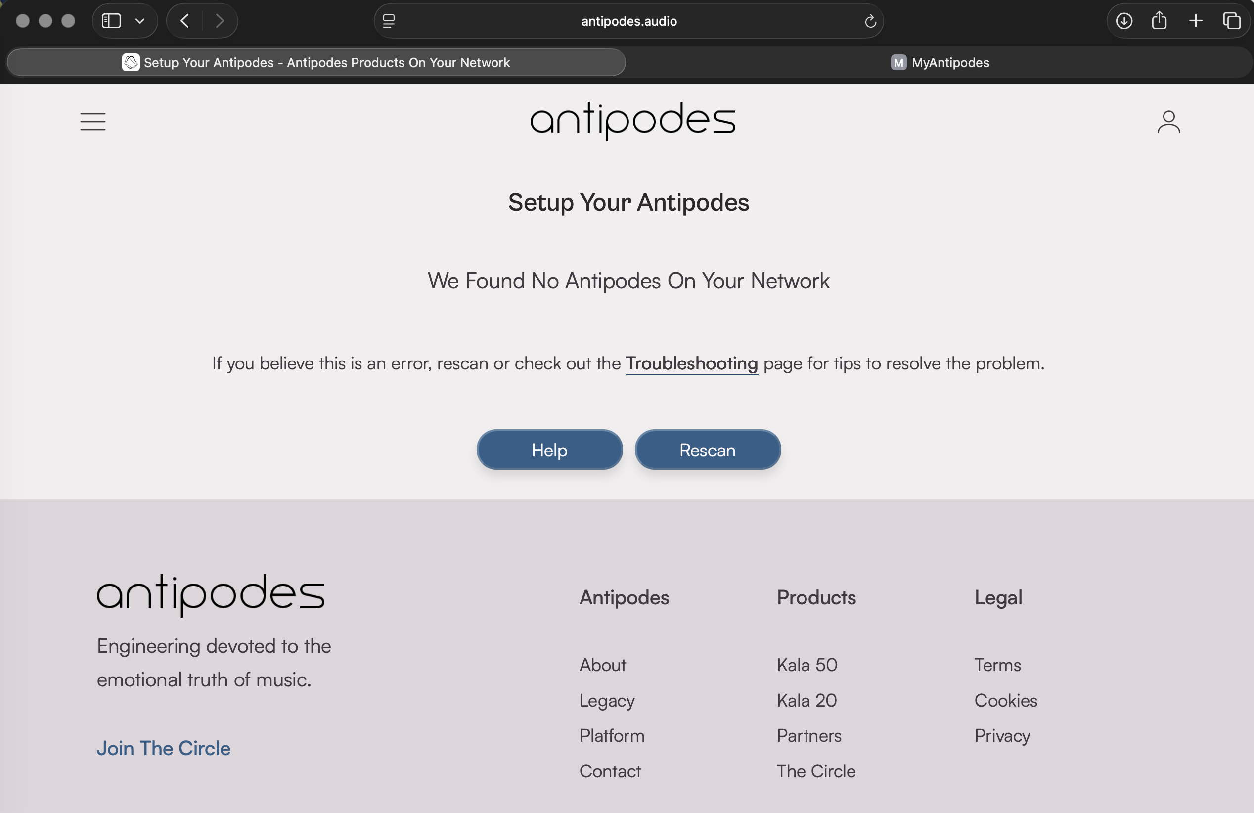 Thanks Mark, all good. I’ve other means to access for now. Just odd timing that today is when it stops being accessible on all my devices, and I also can’t access from the Setup tab at antipodes.audio which also worked consistently. [EDIT] Setup at antipodes.audio is accessible on my Mac, but not iPhone and iPad… still a no-go on all devices with myantipodes.com
