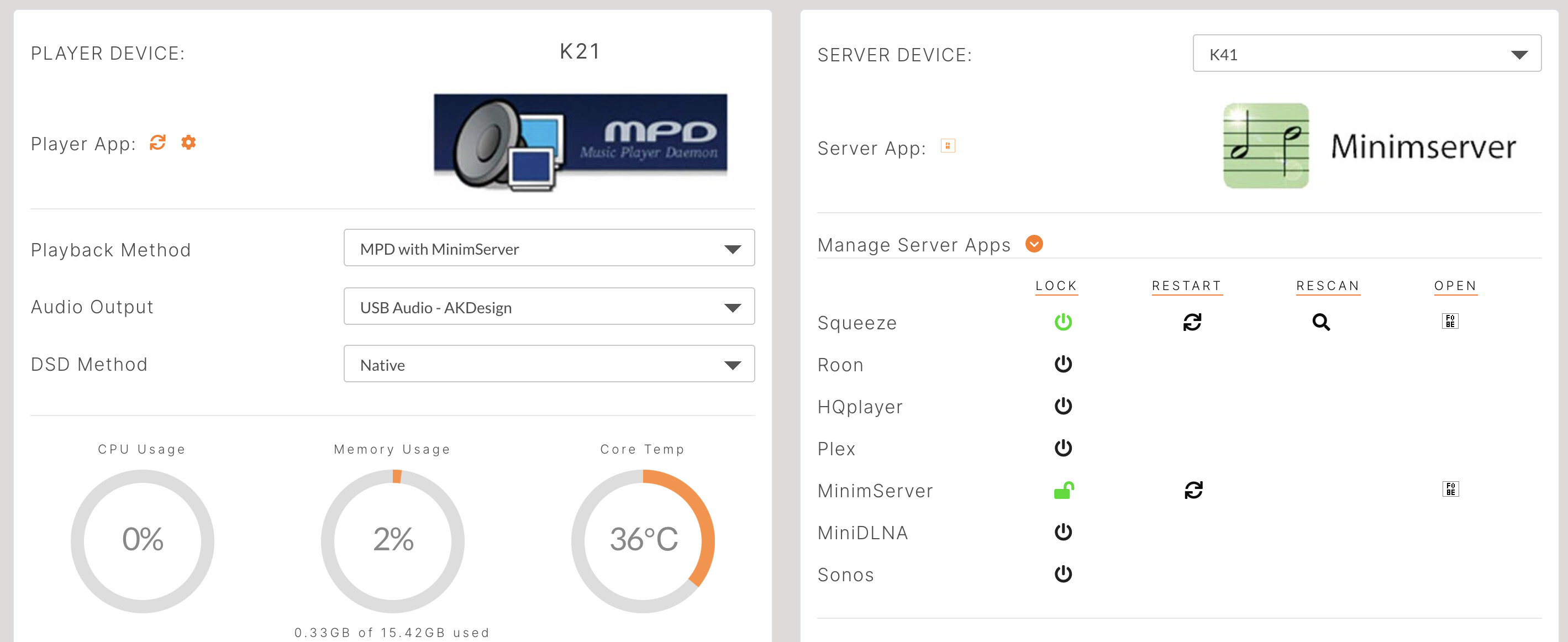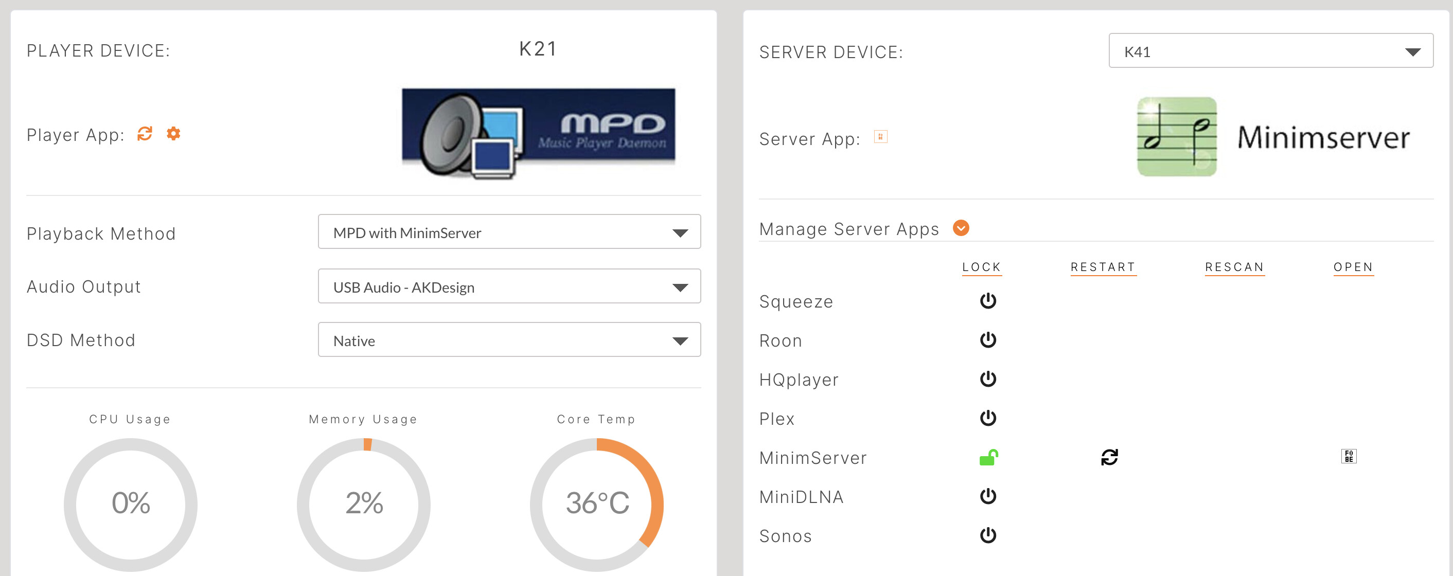 Decided to try Jplay so enabled Minimserver and selected the “MPD with MinimServer” preset. Dashboard refreshes and looks like this (all is good):